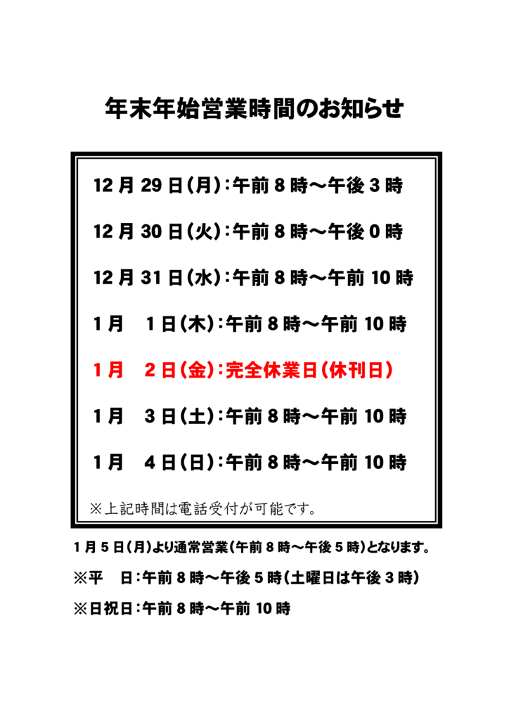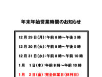 12月29日(月)~1月4日(日)まで、営業時間は通常とは異なります。